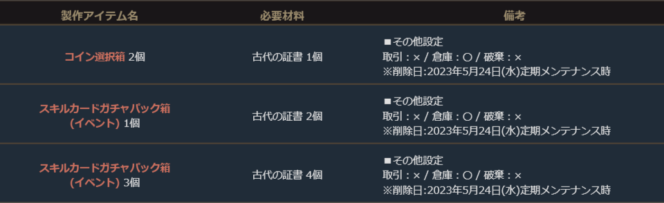 ※期間限定の製作アイテムは、製作可能期間のみゲーム内の「製作」より製作することができます。