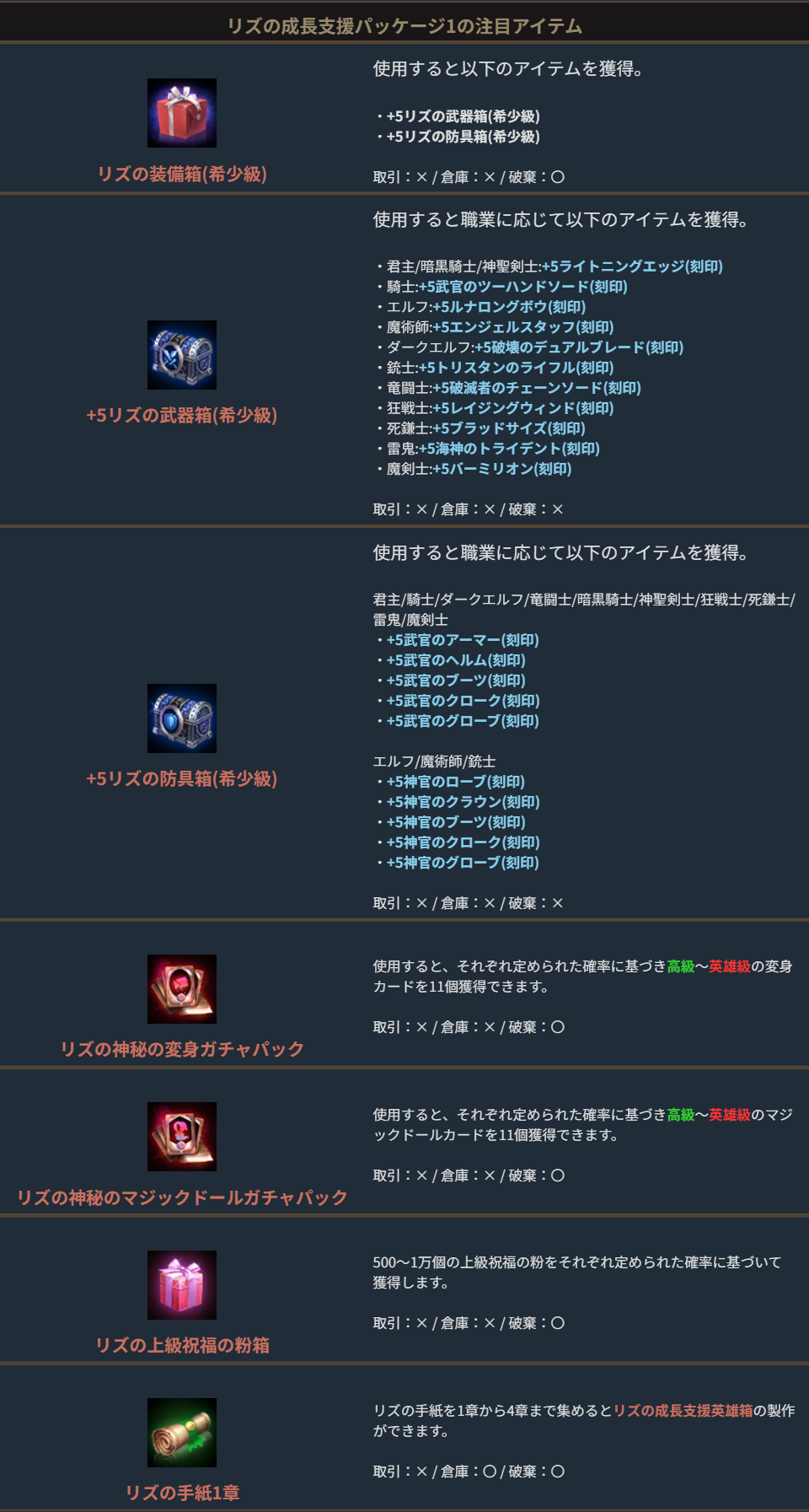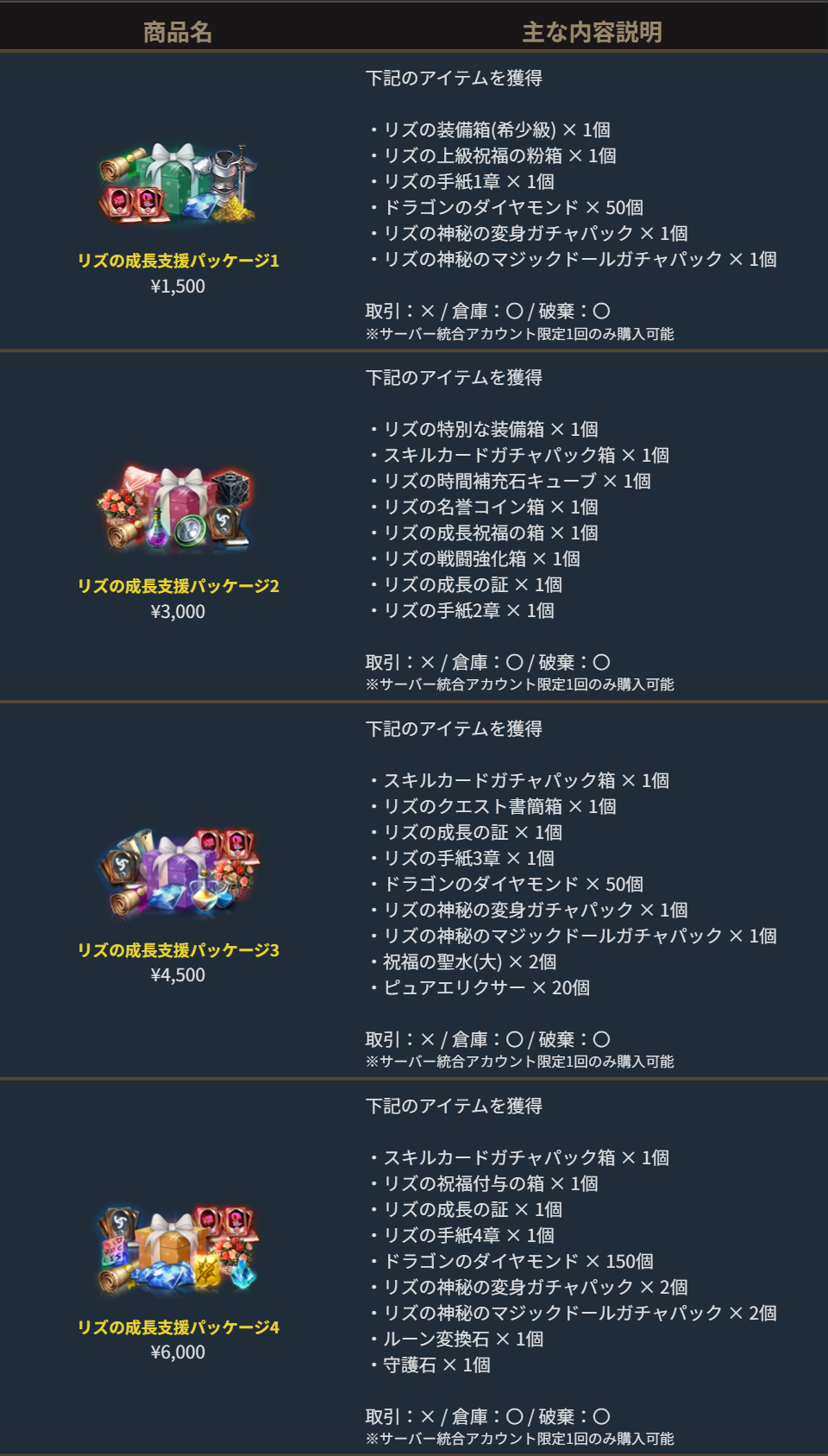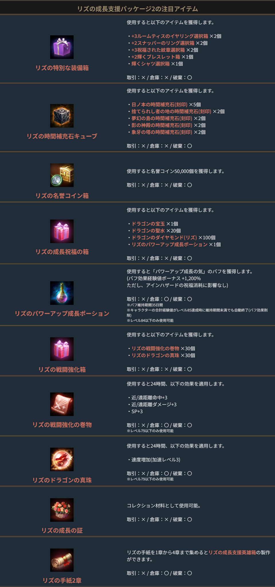 パッケージ2では、85レベル到達まで効果のある経験値ボーナス+1200%のアイテムが獲得でき、各パッケージに付属のリズの手紙を1章から4章まで集めるとリズの英雄級変身カード選択箱と[マジックドールカード]ナイトバルドが入ったリズの成長支援英雄箱を製作できるお得なパッケージになります。