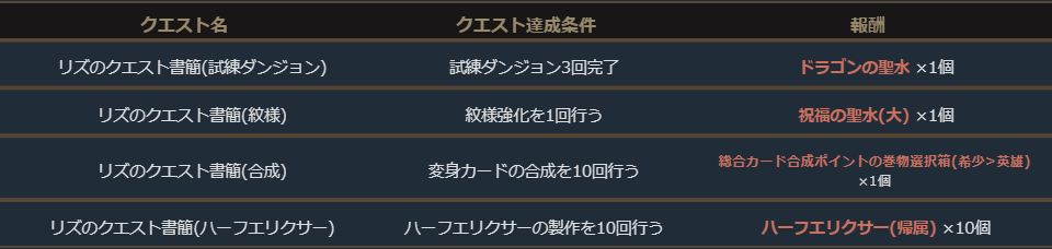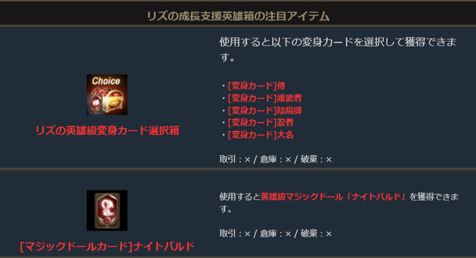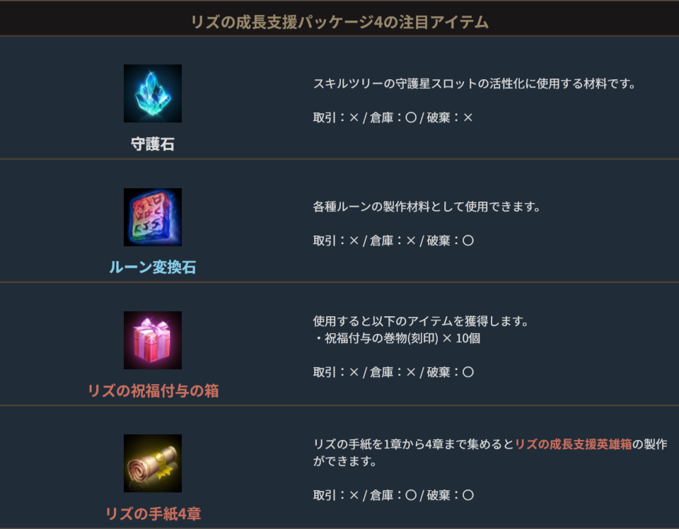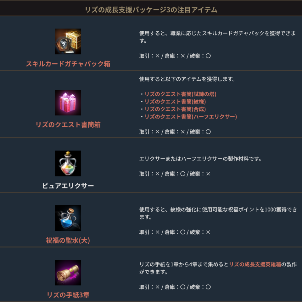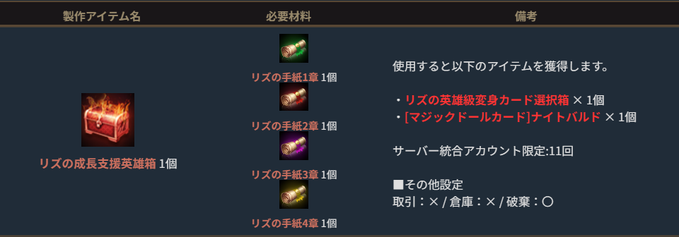 パッケージ2では、85レベル到達まで効果のある経験値ボーナス+1200%のアイテムが獲得でき、各パッケージに付属のリズの手紙を1章から4章まで集めるとリズの英雄級変身カード選択箱と[マジックドールカード]ナイトバルドが入ったリズの成長支援英雄箱を製作できるお得なパッケージになります。