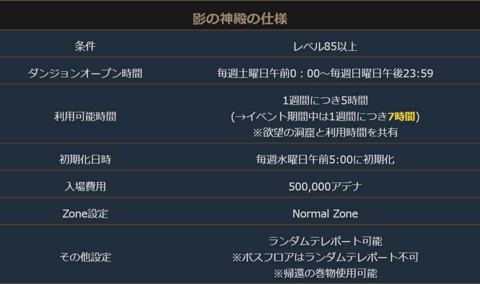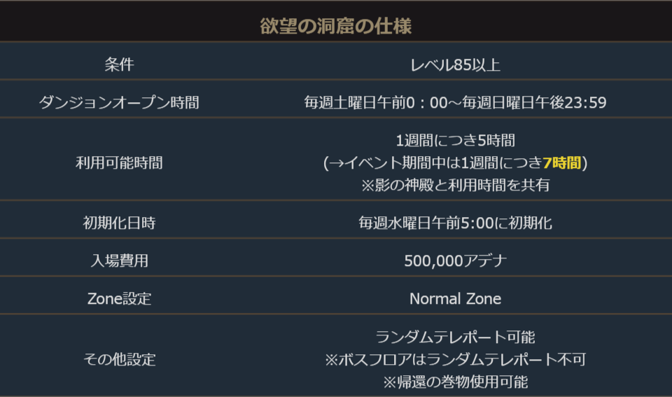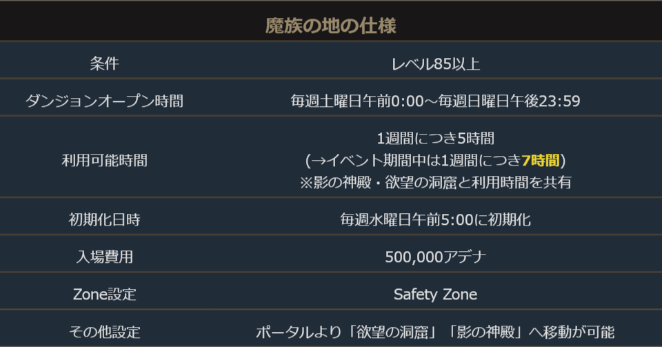 イベント期間中、シーズンダンジョン「魔族の地」の利用可能時間が7時間になります。