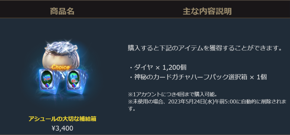 ダイヤ1,200個で3,400円という価格はそのままにダイヤと一緒に「神秘のカードガチャハーフパック選択箱」が一緒に手に入るお得なパッケージです。