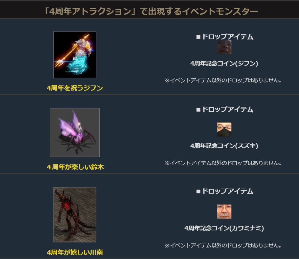 各サーバーのアデン大陸のMAP番号2番「アデン村」にイベントモンスターとして、4周年を迎えてご機嫌な出演者達が出現します。
