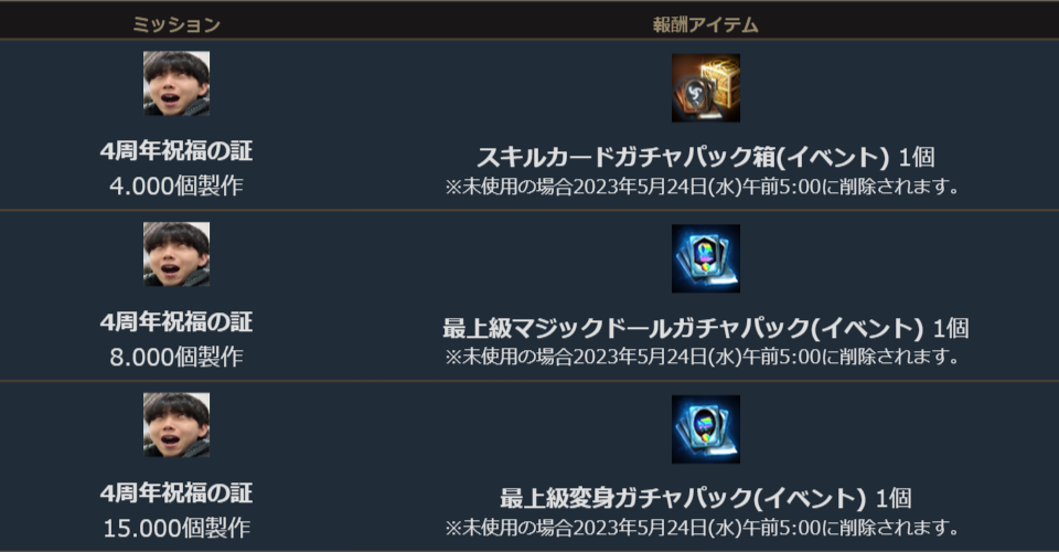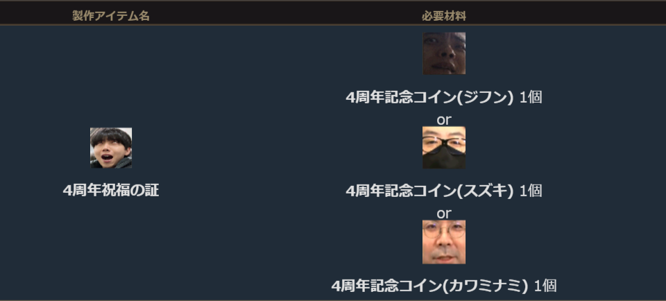 ボスモンスター討伐により獲得した「4周年記念コイン(ジフン/スズキ/カワミナミ)を材料に「4周年祝福の証」を製作することができます。