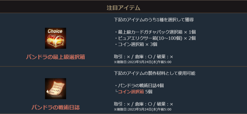 「最上級カードガチャパック選択箱」「ピュアエリクサー箱(10~100個)」「コイン選択箱」から1種を選択して獲得できる「パンドラの最上級選択箱」や「祝福の聖水(大)」「ドラゴンのダイヤモンド」から1種を選択して獲得できる「パンドラの上級選択箱」に加え、各職業のスキルを定められた確率で獲得出来る「スキルカードガチャパック箱(イベント)」が一緒になったお得なパッケージです。