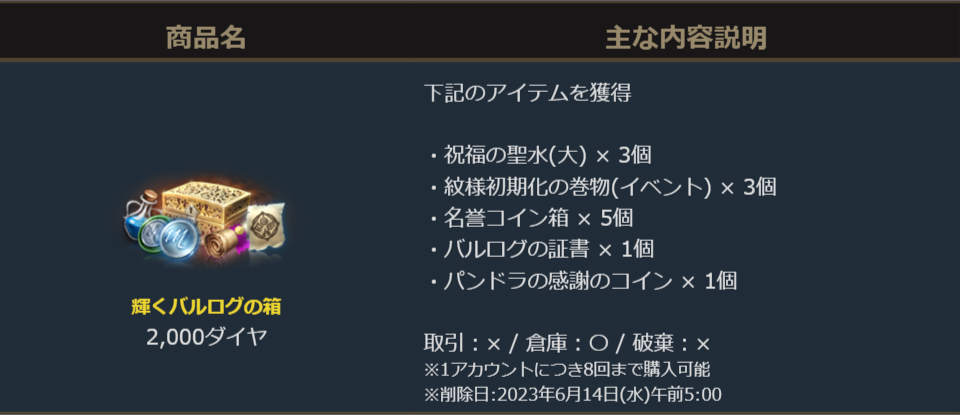 「祝福の聖水(大)」3個、「紋様初期化の巻物(イベント)」3個、「名誉コイン箱」5個に加え、様々なアイテムが製作により獲得が可能な「バルログの証書」や「パンドラの感謝のコイン」がセットになったお得なパッケージです。