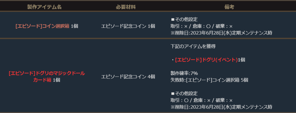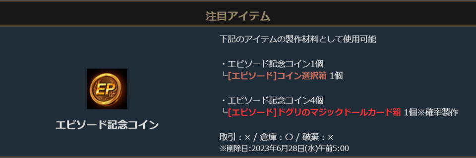 付属の「エピソード記念コイン」4枚で英雄級マジックドールのドグリが獲得できる「[エピソード]ドグリのマジックドールカード箱」の製作に挑戦できます。