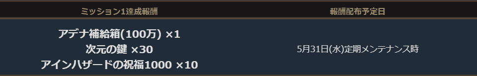 グンターサーバー血盟ミッションの「ミッション1」を達成しました為「ミッション1」の達成報酬の「アデナ補給箱(100万) × 1個」「アインハザードの祝福1000 × 10」「次元の鍵 × 30個」について、2023年5月31日(水)定期メンテナンス前までにグンターサーバーでプレイされていたアカウントへ、2023年5月31日(水)中に郵便でお届けいたします。