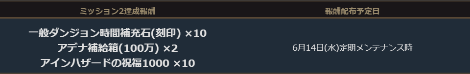 グンターサーバー血盟ミッションの「ミッション2」を達成しました為「ミッション2」の達成報酬の「アデナ補給箱(100万) × 2個」「アインハザードの祝福1000 × 10」「一般ダンジョン時間補充石(刻印) × 10個」について、2023年6月14日(水)定期メンテナンス前までにグンターサーバーでプレイされていたアカウントへ、2023年6月14日(水)中に郵便でお届けいたします。