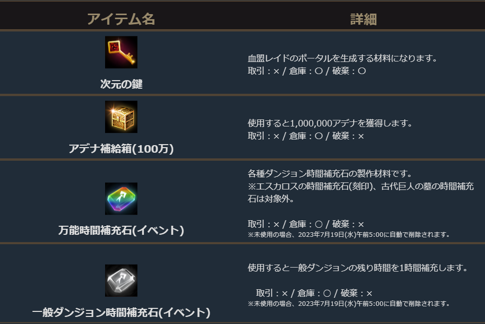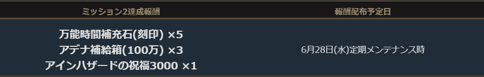 グンターサーバー血盟ミッションの「ミッション3」を達成しました為「ミッション3」の達成報酬の「アデナ補給箱(100万) × 3個」「アインハザードの祝福3000 × 1」「万能時間補充石(刻印) × 5個」について、2023年6月28日(水)定期メンテナンス前までにグンターサーバーでプレイされていたアカウントへ、2023年6月28日(水)中に郵便でお届けいたします。