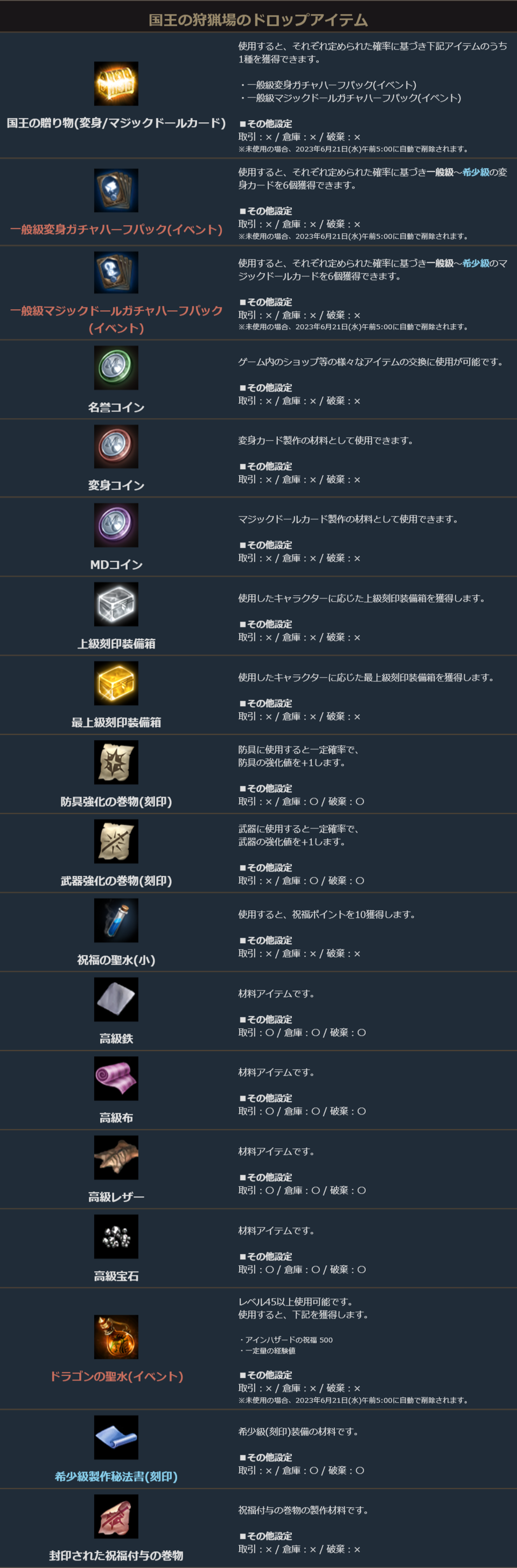 イベント期間中、国王の狩猟場におけるモンスターのドロップは下記となります。