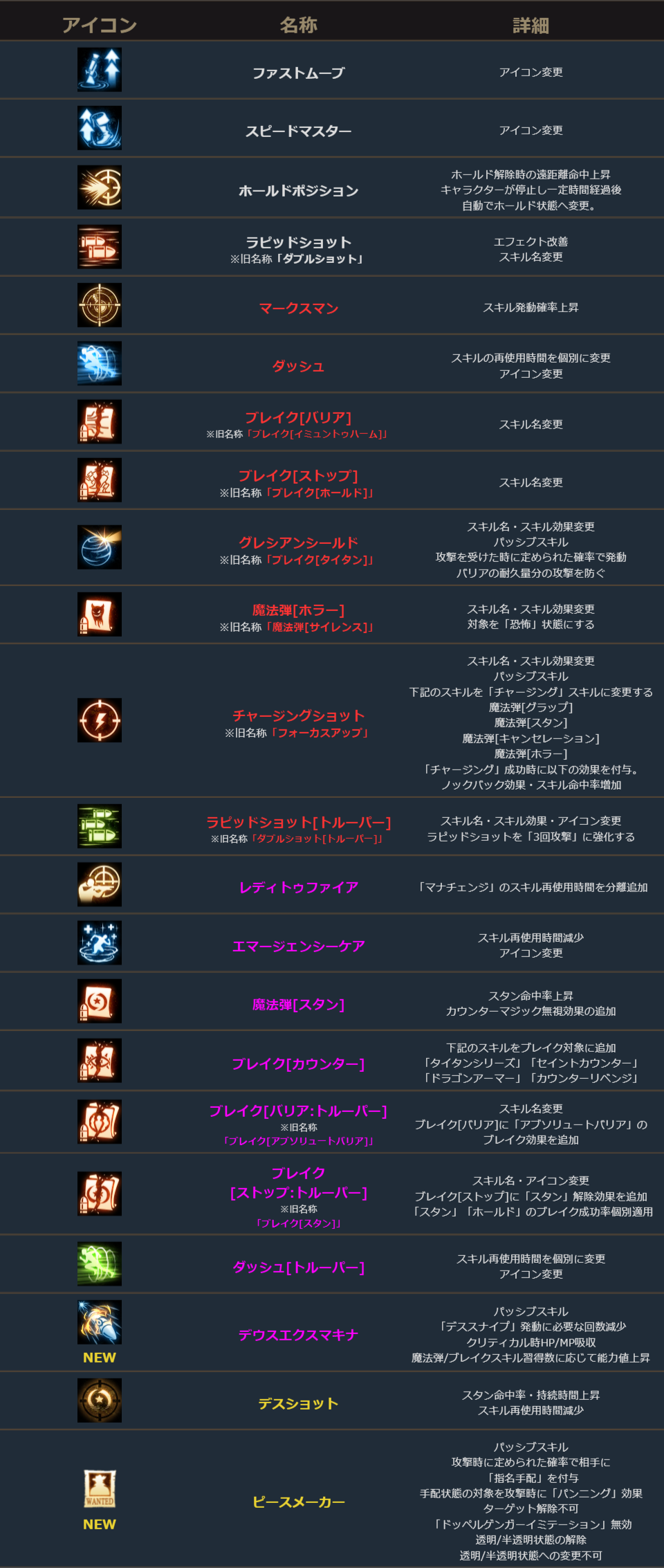 銃士は、新規スキル2種追加、既存スキル20種変更。