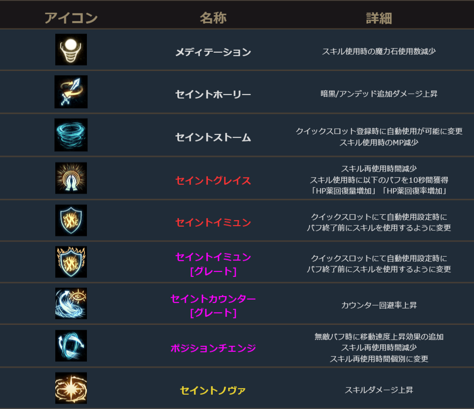 神聖剣士は、既存スキル9種変更。