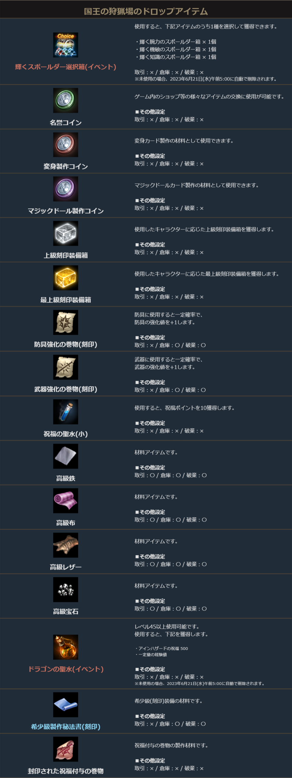イベント期間中、国王の狩猟場におけるモンスターのドロップは下記となります。