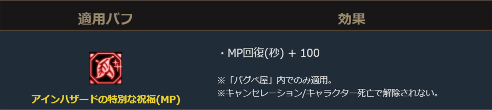 「バグべ屋」入場中はキャラクターへ下記のバフが適用されます。