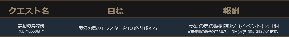 「夢幻の島アップデート記念イベント」の開催期間と「夢幻の島時間補充石(イベント)」の削除期限を追記致しました。