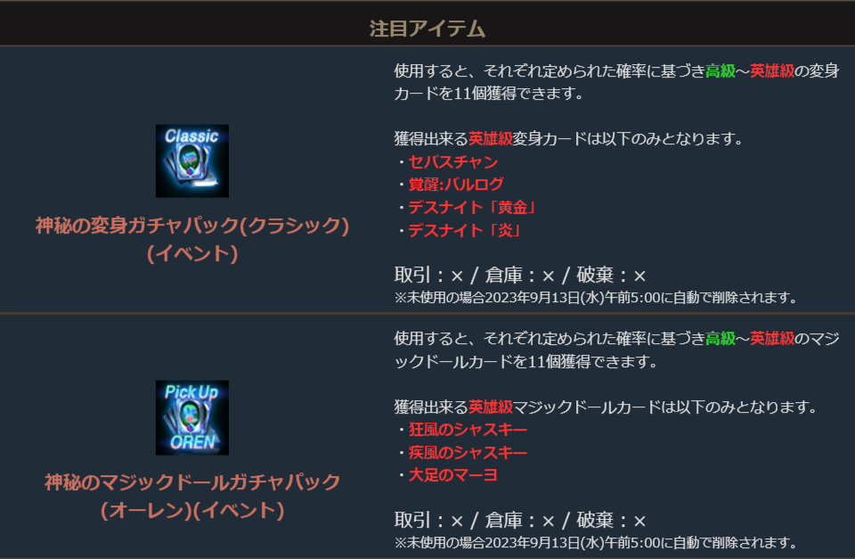 ※一部アイテムは未使用の場合、一定期間が経過すると自動で削除されます。詳しくは各アイテムの詳細をご確認ください。