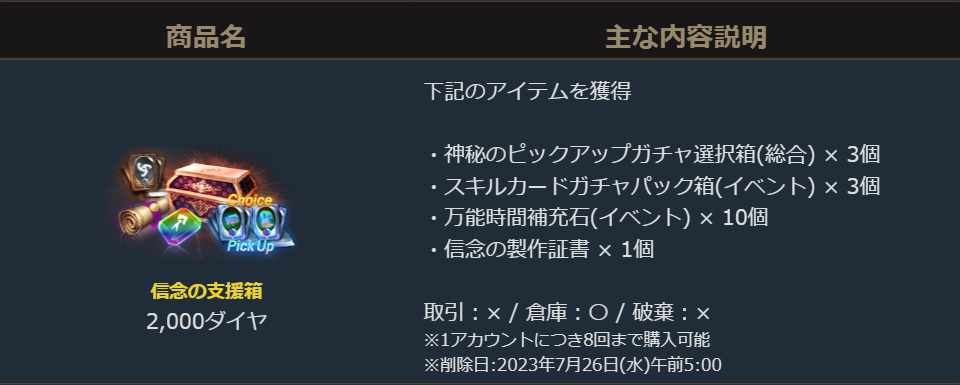 新たに登場した「神秘のピックアップガチャパック選択箱(総合)」と一緒に「スキルカードガチャパック箱(イベント)」や「万能時間補充石(イベント)」が付いてくるパッケージです。