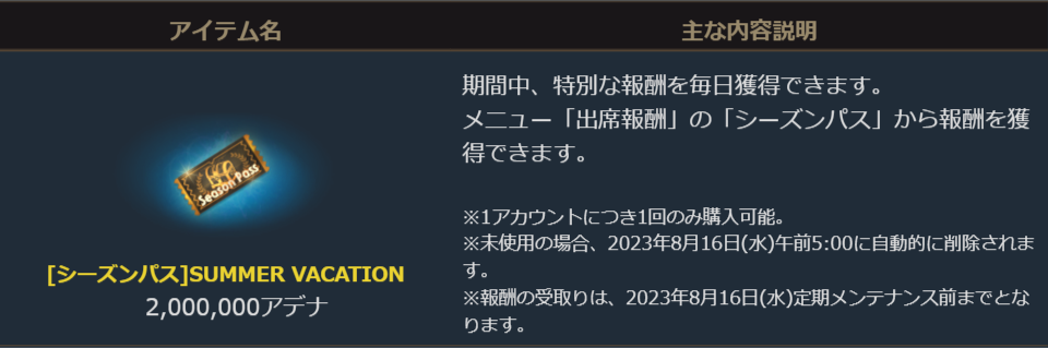 期間中、特別な報酬を毎日獲得可能になる[シーズンパス]SUMMER VACATIONをゲーム内ショップよりアデナにて購入が可能です。