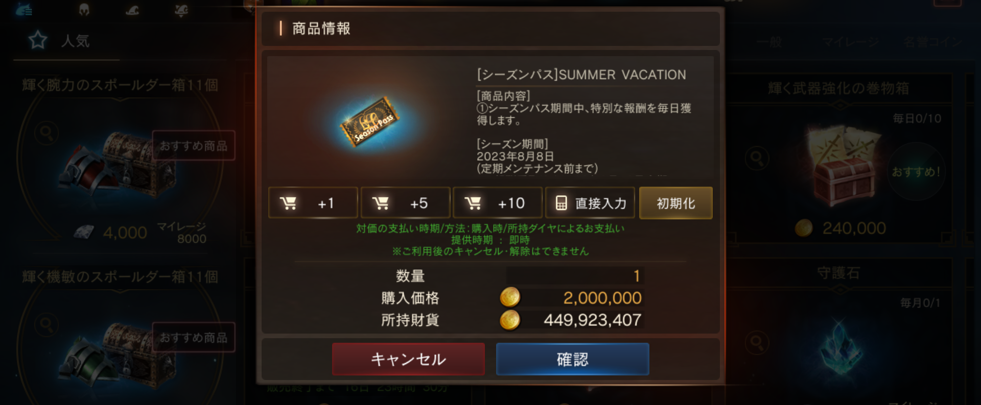 1.ショップの「イベント強化」画面から「[シーズンパス]SUMMER VACATION」を2,000,000アデナと交換