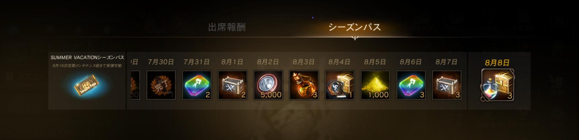 2.メニューの「出席報酬」の「シーズンパス」画面から報酬を受け取り