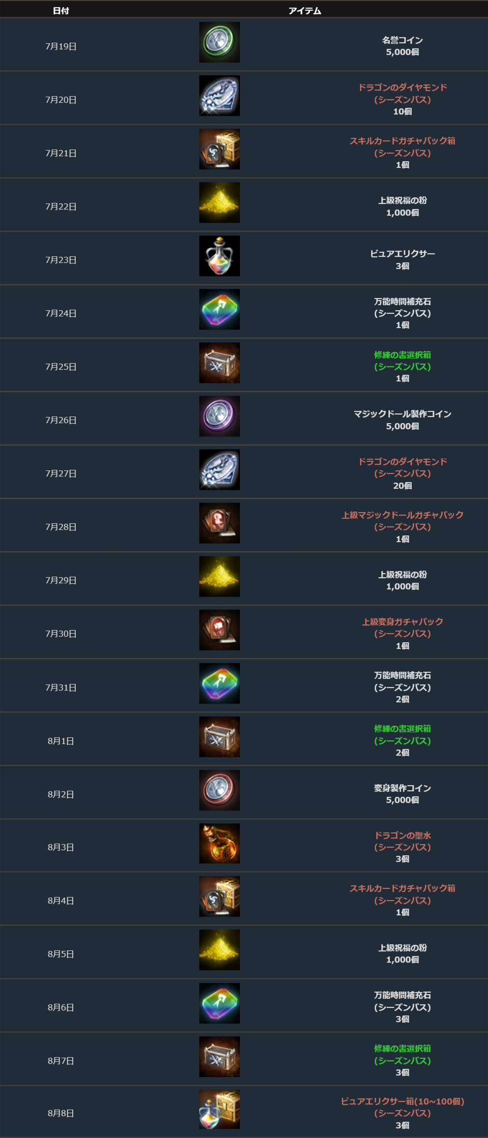 下記の日付以降にそれぞれの報酬を獲得できます。