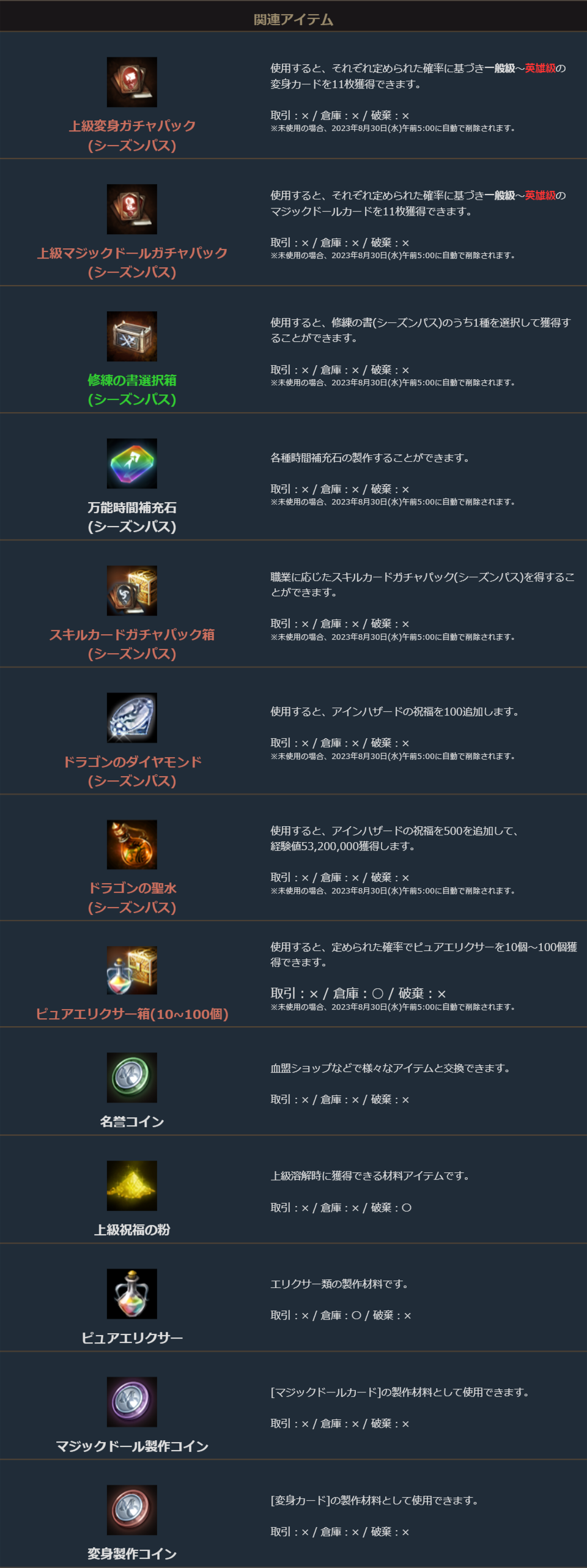 ※一部アイテムが期間終了後も未使用の場合、一定期間が経過すると自動で削除されます。詳しくは各アイテムの詳細をご確認ください。