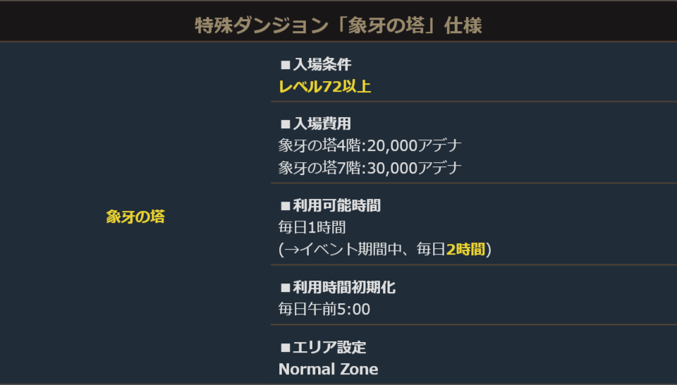 「象牙の塔」はレベル72以上で利用可能な特殊ダンジョンです。