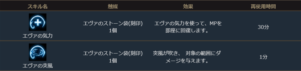 「エヴァのストーン(刻印)」装着時、下記の装備スキルを使用することができます。