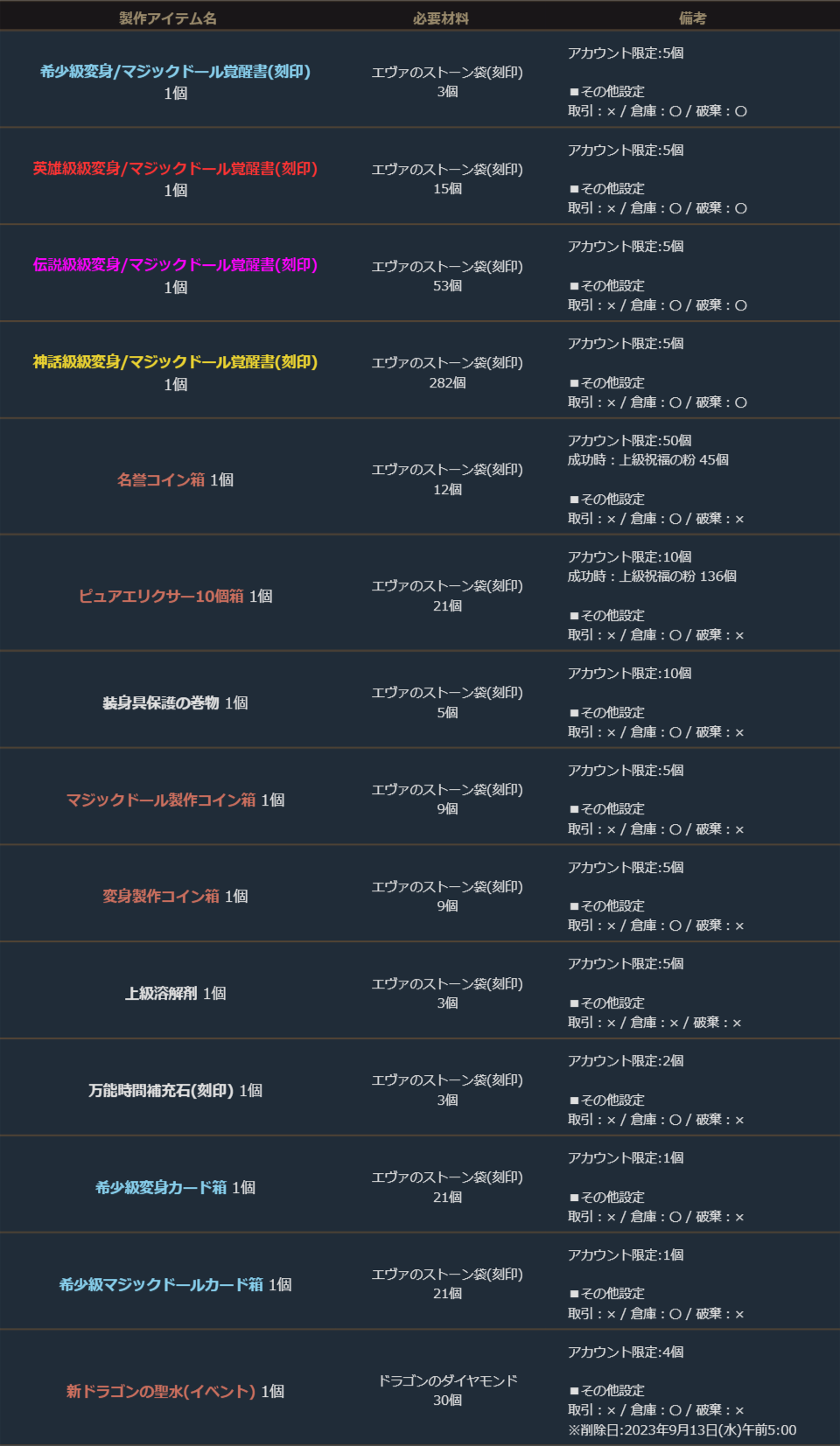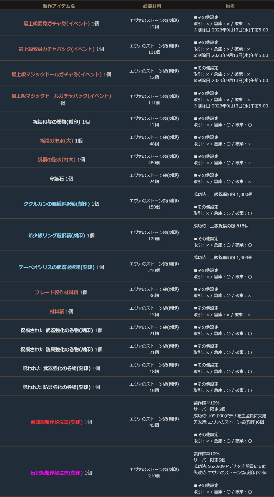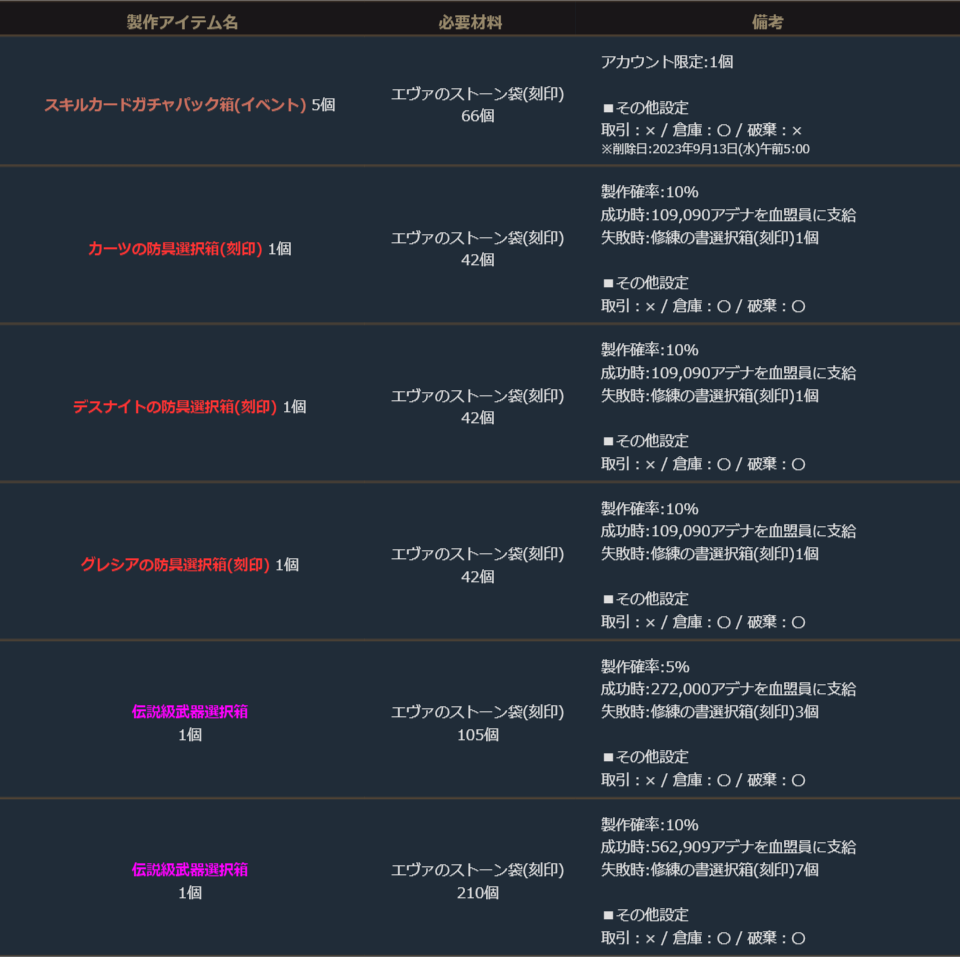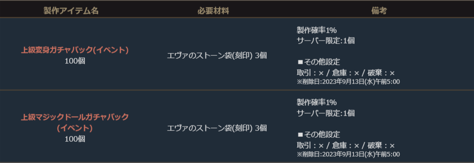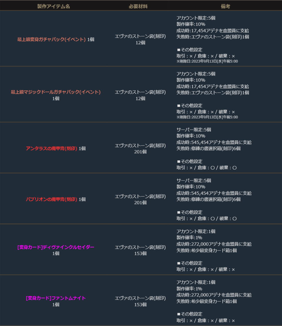 下記のアイテムは製作可能期間のみ製作することができます。