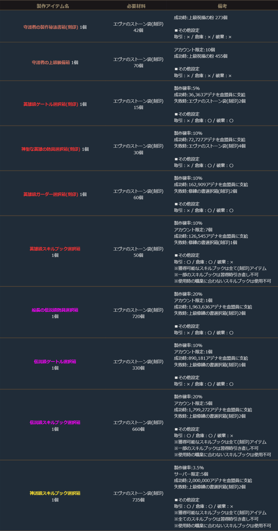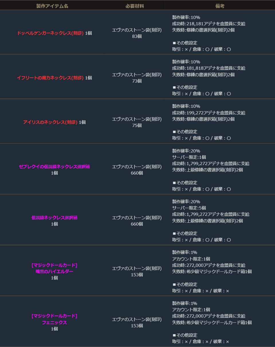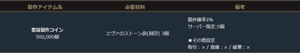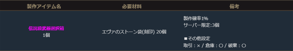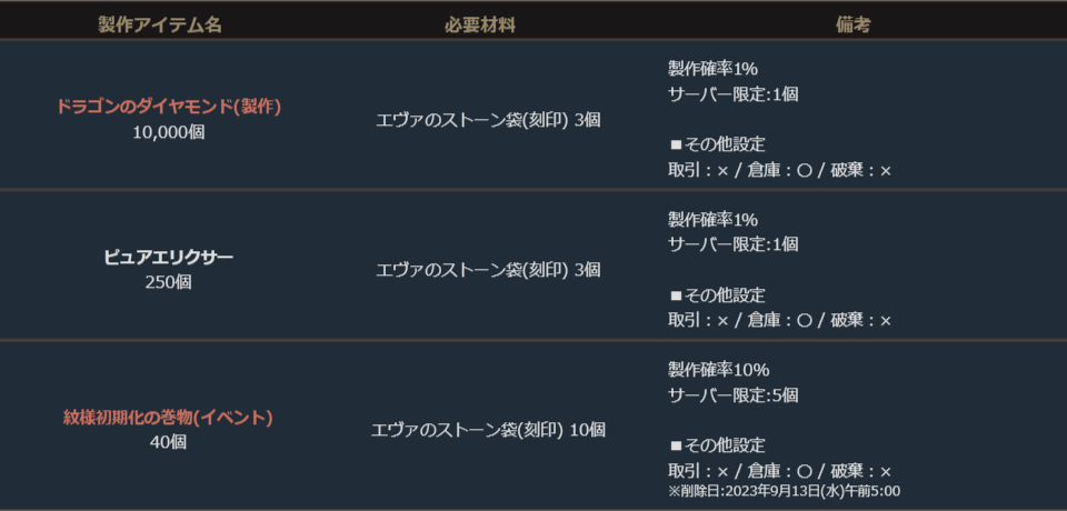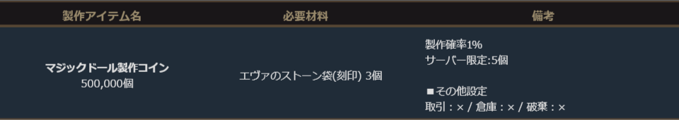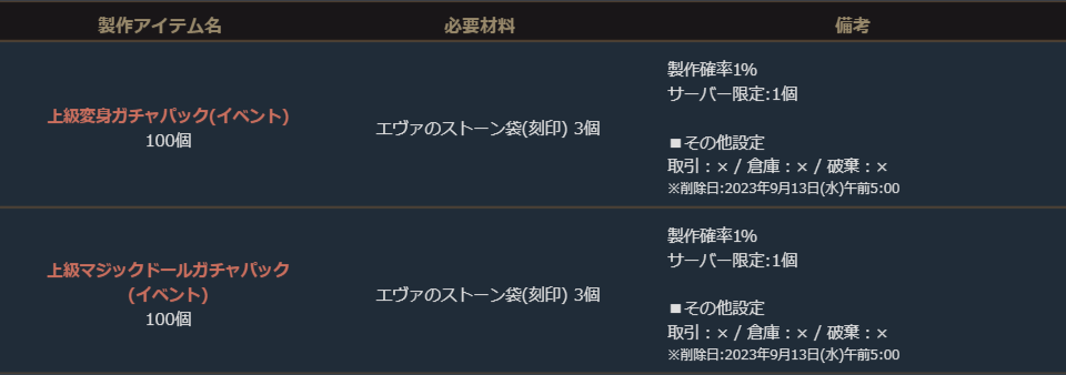※サーバー数量限定の製作アイテムは、各サーバーで製作できる数量に上限があります。