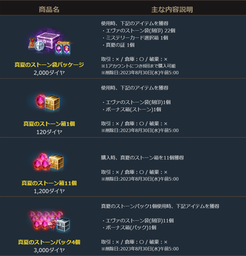 特別な製作の材料として使用可能で、そのまま使用した場合でも様々なバフ効果が得られる「エヴァのストーン袋(刻印)」を含む様々なパッケージが登場しました。