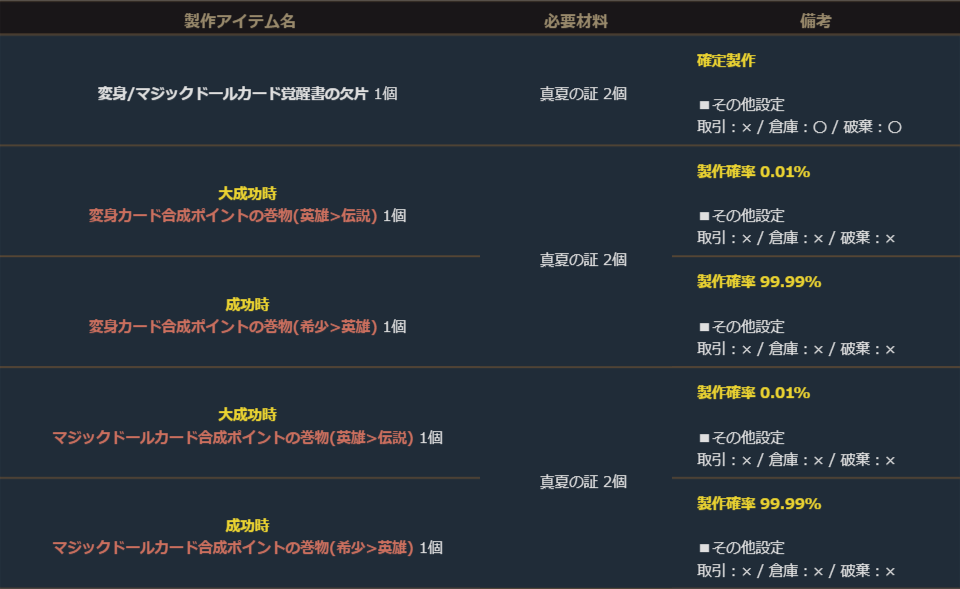 また、一部のアイテム製作成功時には、成功ペイバックとして記載のアイテムも獲得できます。