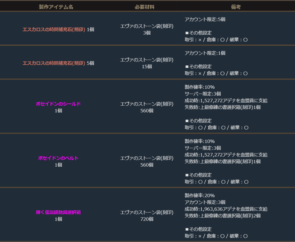 期間中、「エヴァのストーン袋(刻印)」を使用して、下記の製作を行うことができます。