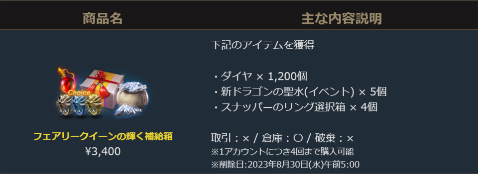 ダイヤ1,200個で3,400円という価格はそのままに、「新ドラゴンの聖水(イベント)」と一緒に「スナッパーのリング選択箱」が付属したお得なパッケージです。