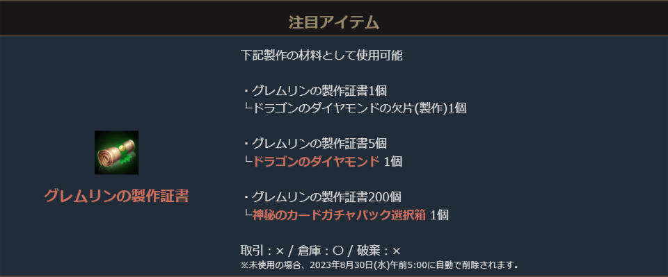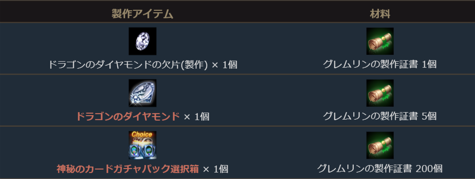 「変身製作コイン」「マジックドール製作コイン」と一緒に「ドラゴンのダイヤモンド」か「ドラゴンのダイヤモンドの欠片(製作)」や新たに「神秘のカードガチャパック選択箱」の製作材料となる「グレムリンの製作証書」が手に入る、毎日購入可能なお得なパッケージです。