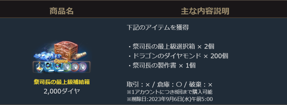 2023年8月19日より販売を開始いたします「祭司長の最上級補給箱」のご案内を申し上げます。