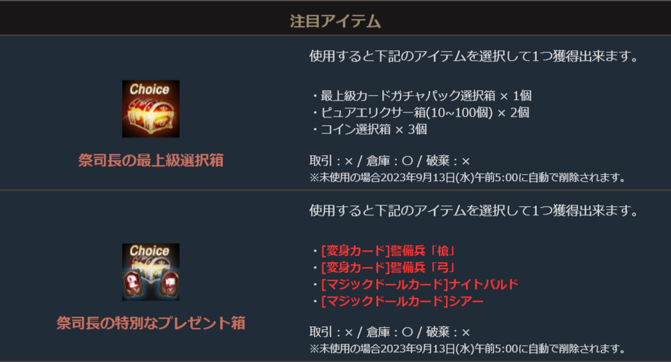 ※一部アイテムは未使用の場合、一定期間が経過すると自動で削除されます。詳しくは各アイテムの詳細をご確認ください。