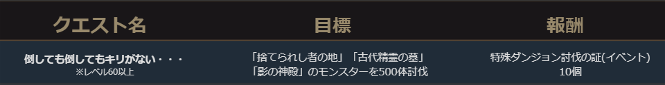 イベント期間中はレベル60以上のキャラクターへ毎日クエストが配信されクエストをクリアする事で「特殊ダンジョン討伐の証(イベント)」を報酬として獲得できます。