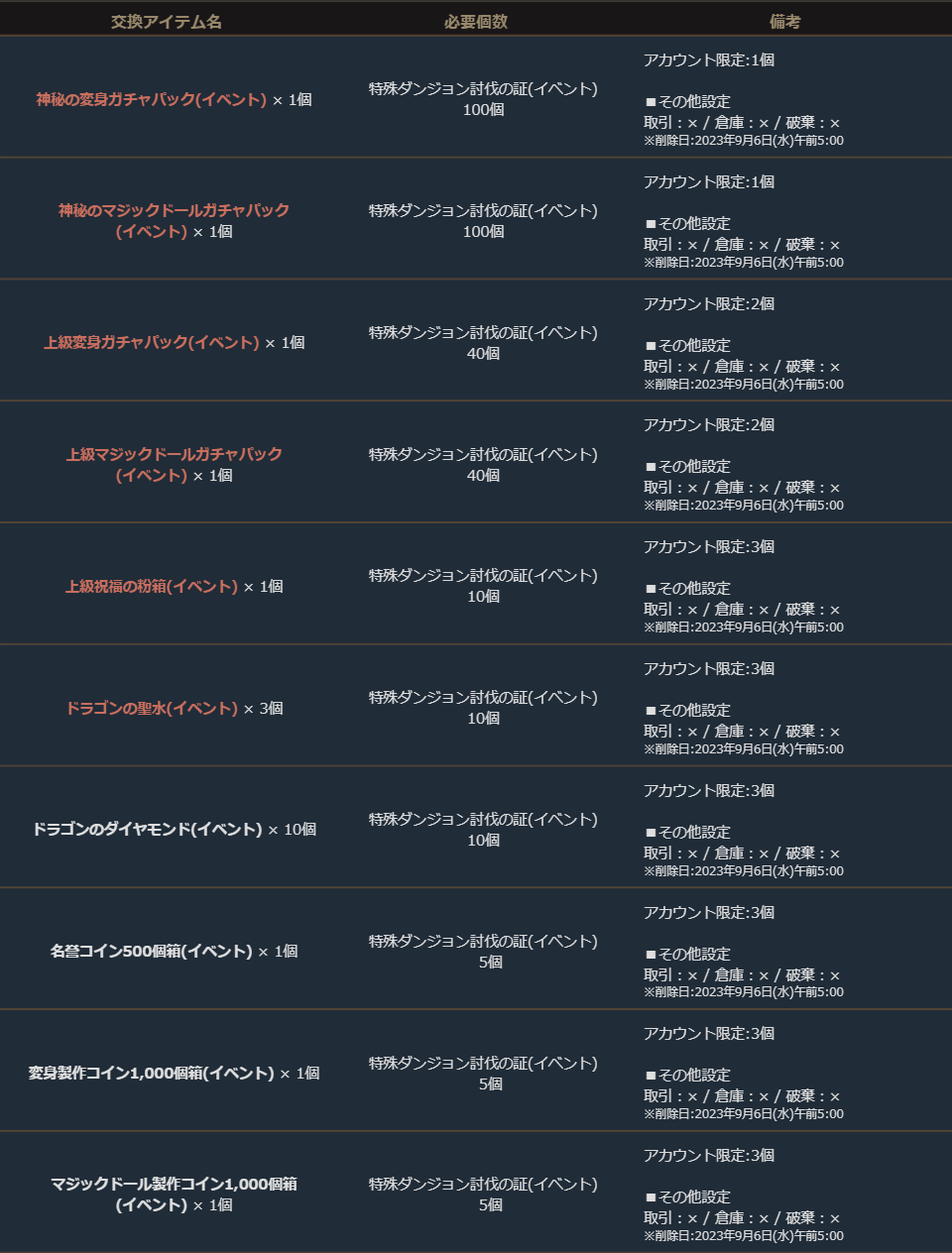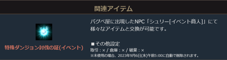イベントクエストの報酬「特殊ダンジョン討伐の証(イベント)」はバグべ屋に出現したNPC「シュリー[イベント商人]」にて下記のリストのアイテムと交換が可能です。