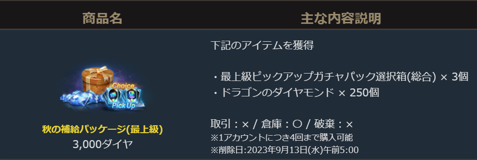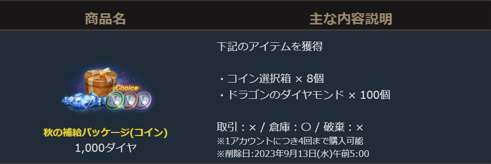 たくさんの「コイン選択箱」と一緒に「ドラゴンのダイヤモンド」が獲得出来る「秋の補給パッケージ(コイン)」と「最上級ピックアップガチャパック選択箱(総合)」3個と一緒に「ドラゴンのダイヤモンド」を獲得出来る「秋の補給パッケージ(最上級)」の2種類のパッケージです。