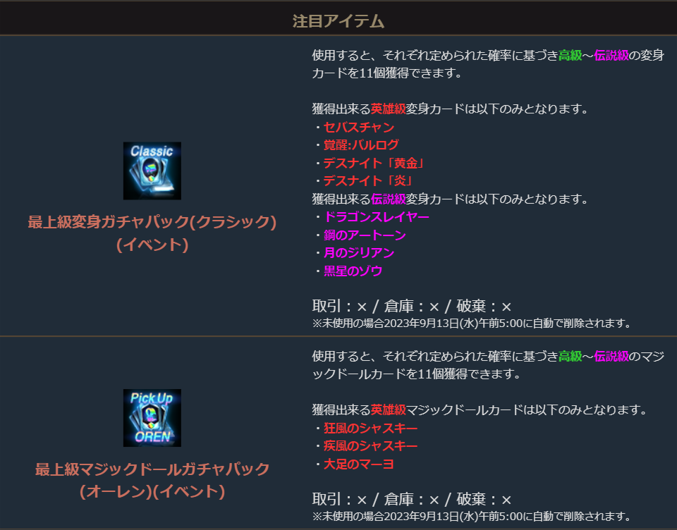 ※一部アイテムは未使用の場合、一定期間が経過すると自動で削除されます。詳しくは各アイテムの詳細をご確認ください。
