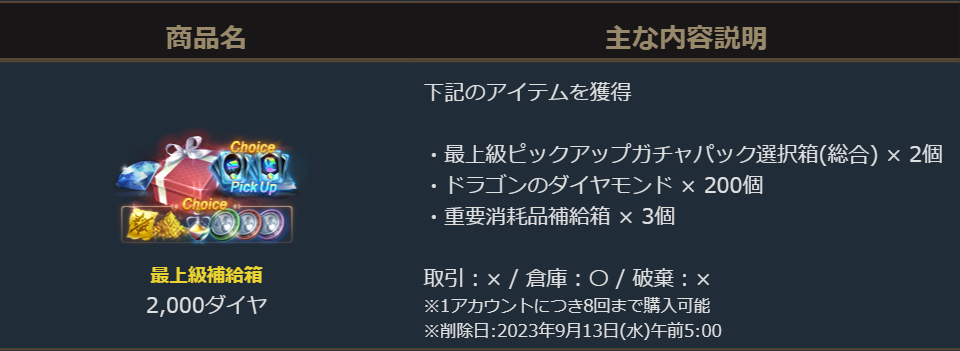 「最上級ピックアップガチャパック選択箱(総合)」と様々なアイテムを選択できる「重要消耗品補給箱」の2個と一緒に「ドラゴンのダイヤモンド」を獲得出来るパッケージが登場しました。