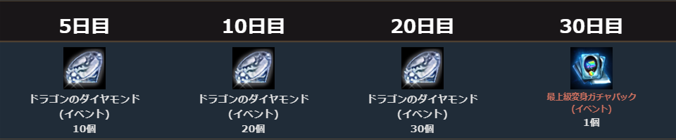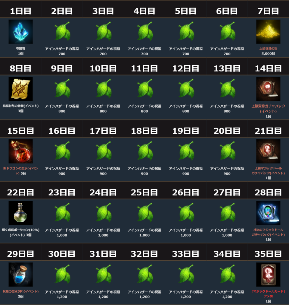 多くのアインハザードの祝福に加え、「守護石」や「祝福の聖水(中)」などが手に入るほか、連続出席報酬30日目には「最上級変身ガチャパック(イベント)」が獲得できます。