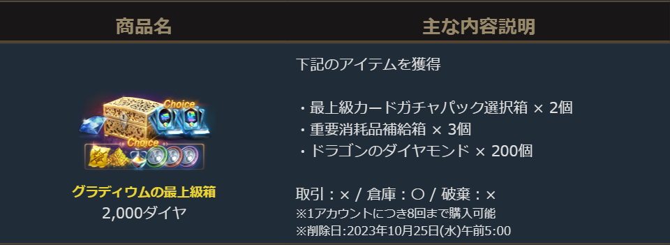 「最上級カードガチャパック選択箱2個」とキャラクター強化に役立つ様々なアイテムを選択できる「重要消耗品補給箱3個」と一緒に「ドラゴンのダイヤモンド200個」を獲得出来るパッケージが登場します。