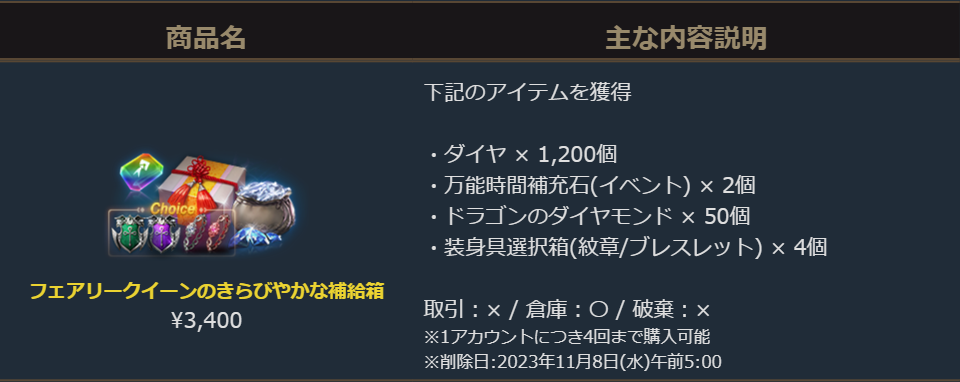 ダイヤ1,200個で3,400円という価格はそのままに、「万能時間補充石(イベント)」や「ドラゴンのダイヤモンド」といった狩りの必需品に加えて好きな装身具を選択して獲得出来る「装身具選択箱(紋章/ブレスレット)」が付属したお得なパッケージです。