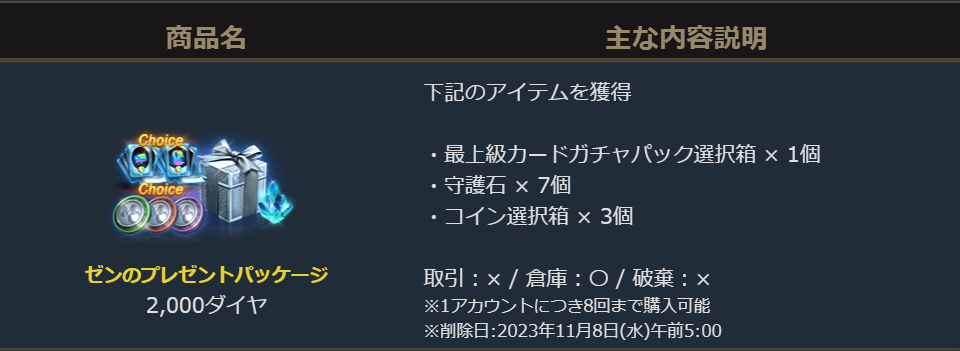 たくさんの「守護石」と一緒に「最上級カードガチャパック選択箱」と「コイン選択箱」が獲得出来る充実のパッケージです。