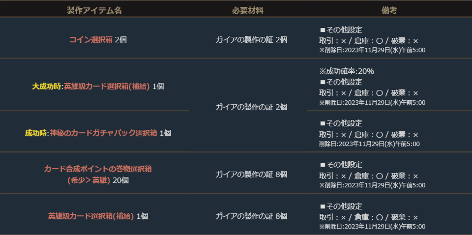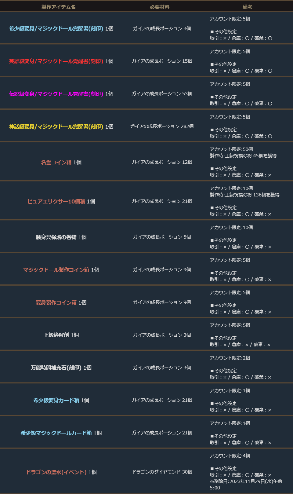※期間限定の製作アイテムは、製作可能期間のみゲーム内の「製作」より製作することができます。