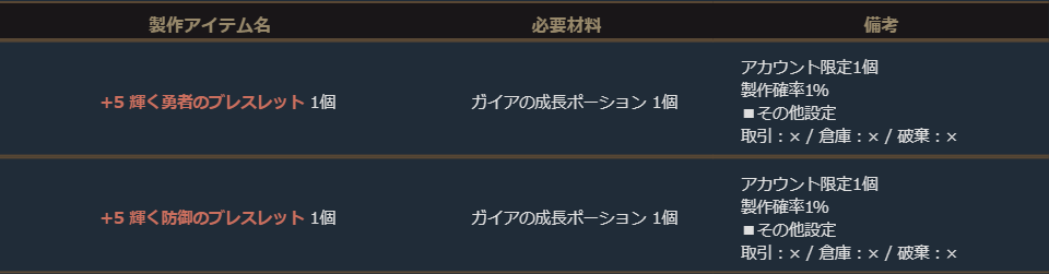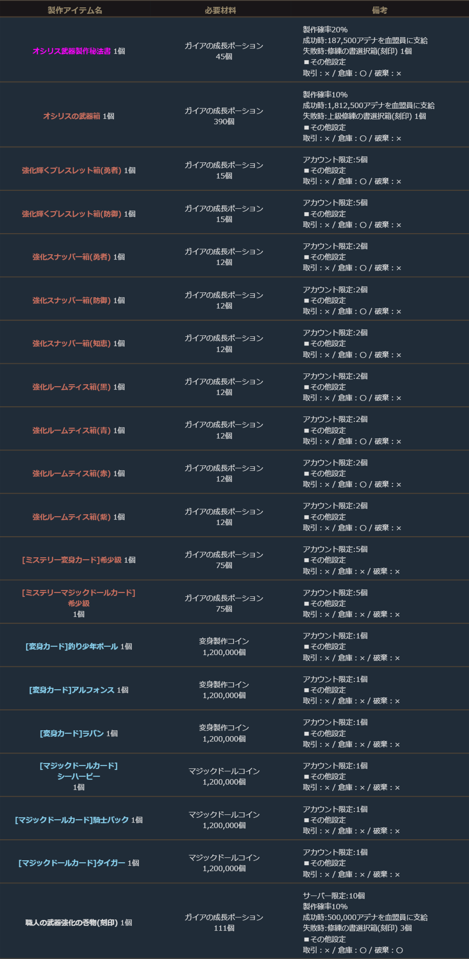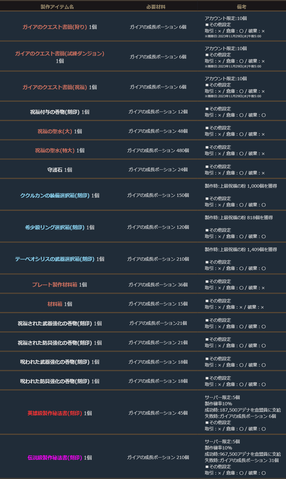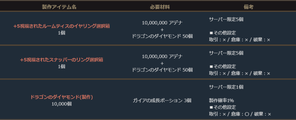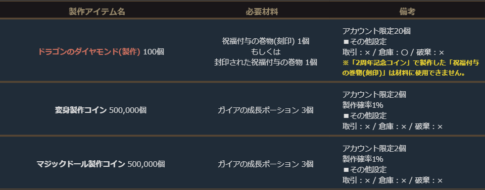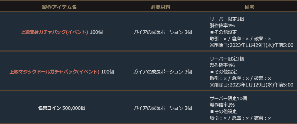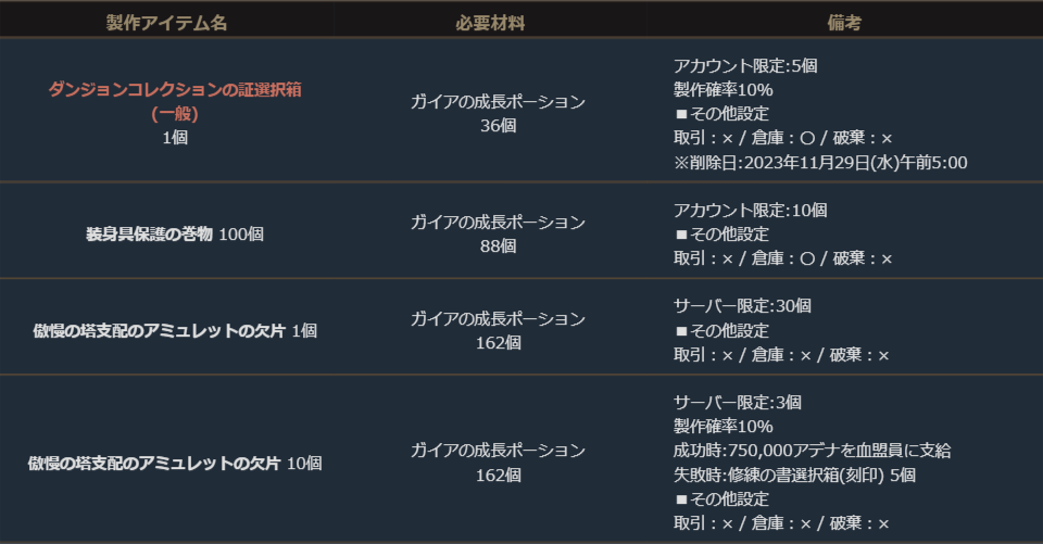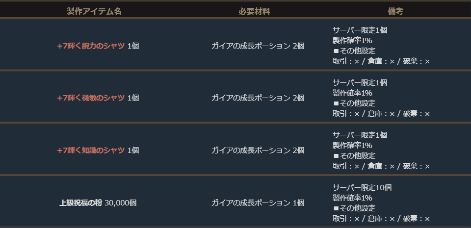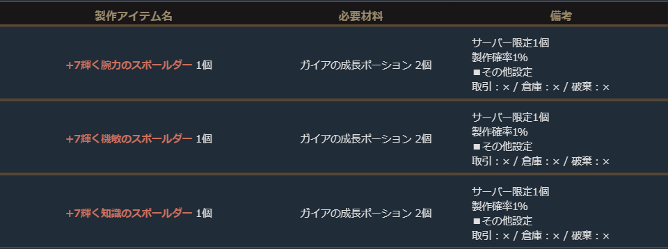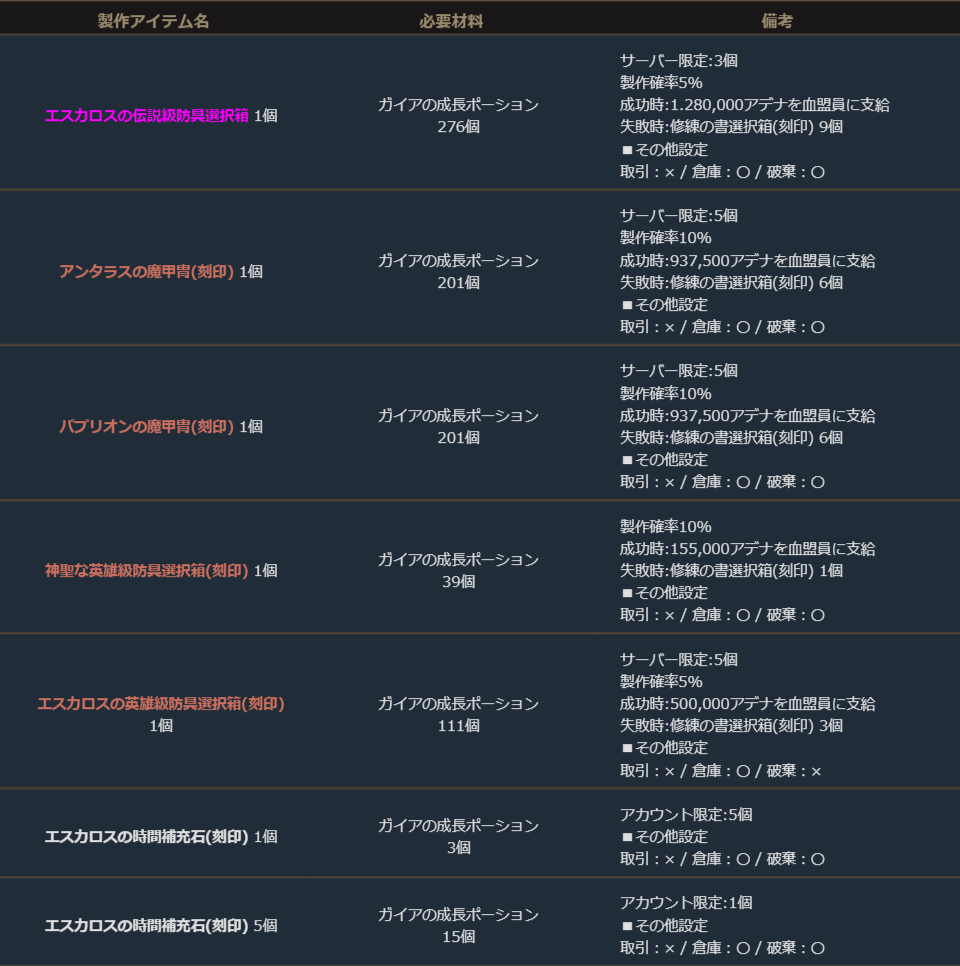※サーバー数量限定の製作アイテムは、各サーバーで製作できる数量に上限があります。