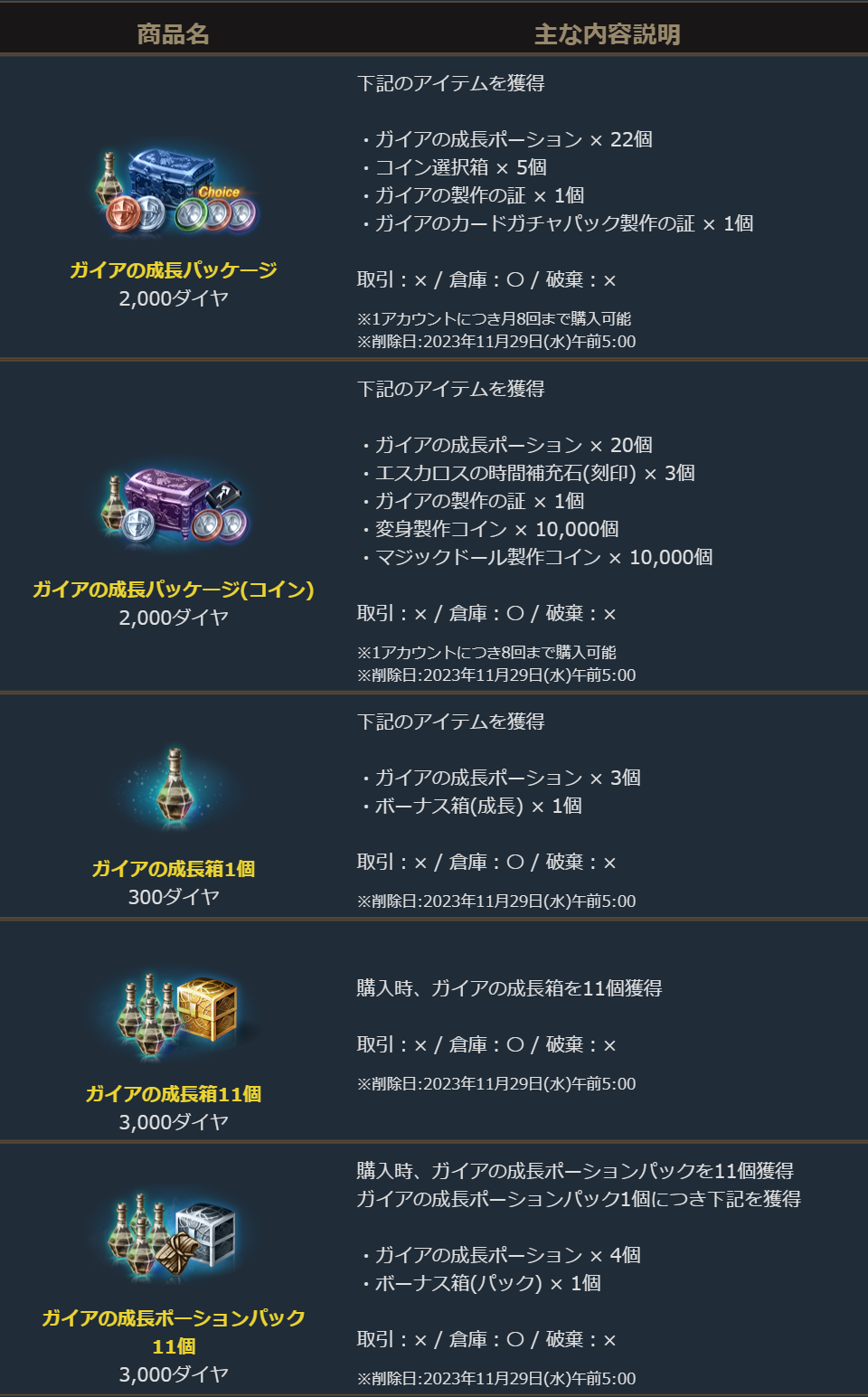 また、商品紹介にガイアの成長ポーション20個に加え、変身製作コインとマジックドール製作コインを10,000個獲得できる「ガイアの成長パッケージ(コイン)」を追加いたしました。