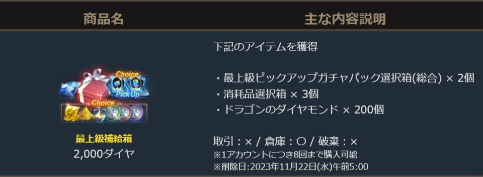 複数の「最上級ピックアップガチャパック選択箱(総合)」とキャラクター強化に役立つ様々なアイテムを選択できる「消耗品選択箱」と一緒にたくさんの「ドラゴンのダイヤモンド」を獲得出来るパッケージです。